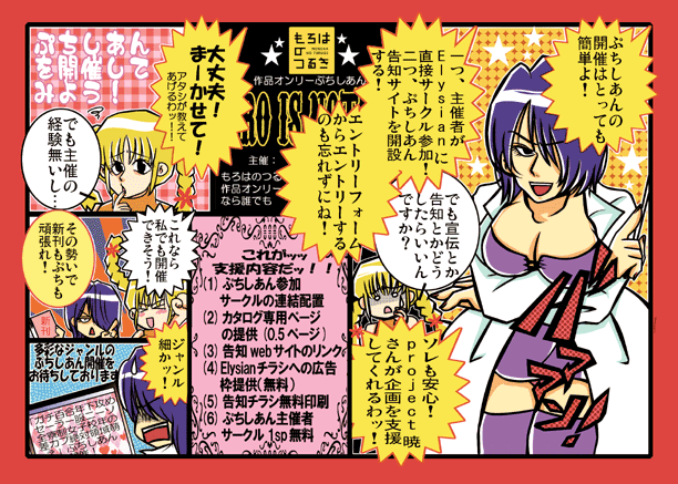 2013/06/22 Category : WEB漫画(読切) HERO IS NOT HEROINEの二人でエリシアンパンフレット用フルカラー漫画 *クリックで拡大します。現・エリシアンオフィス様主催の札幌の同人誌即売会エリシアンの2013年のパンフレット用に描いたフルカラー漫画。イベント内で開催できるプチオンリーの主催方法ハウツーもの。A5サイズにこの情報量を収めるのに非常に難儀しました。誰か「もろはのつるぎオンリー」やってくれませんかねw書き文字で隠れてますが実はパンチラしてる。 PR